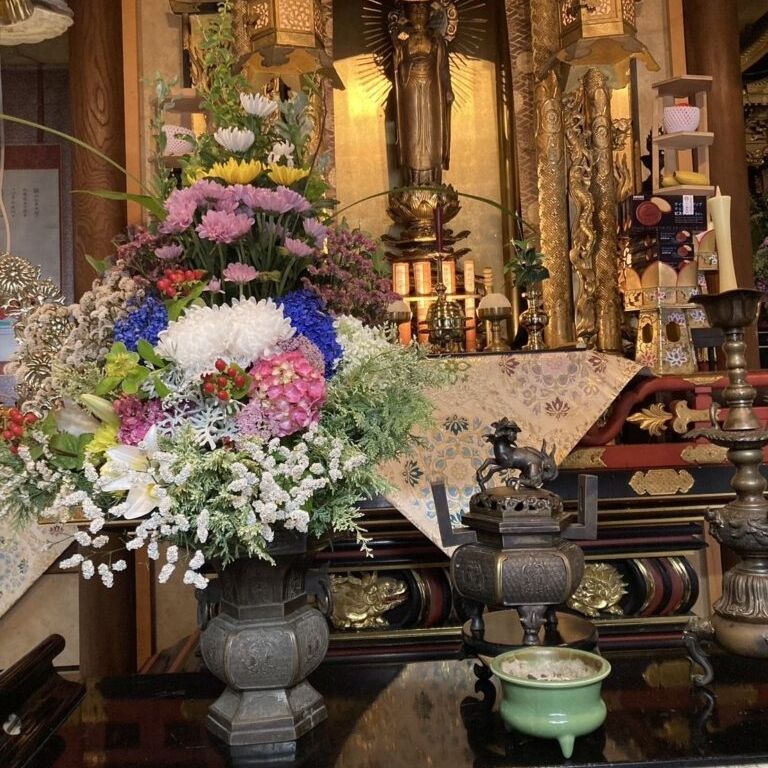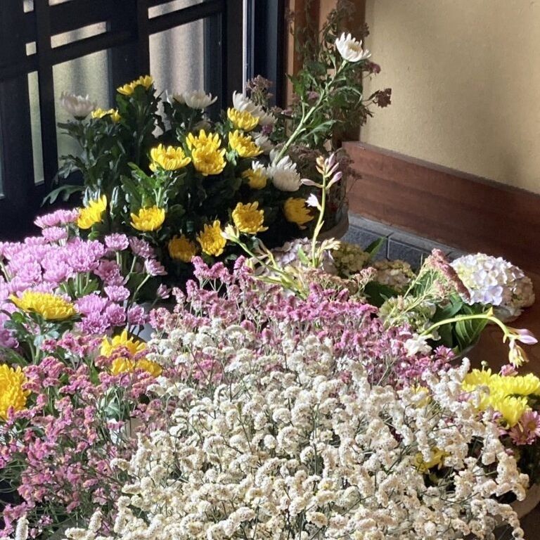 また、お寺の堂内には皆さまの心が集まり、静かで穏やかな時間が流れたように感じました。そのひとときを彩ってくれたのが、生けた花々です。